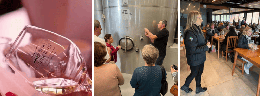 Conheça a história da família e os segredos da produção de vinhos em um tour guiado pela vinícola. Deguste dois vinhos direto dos tanques e mais seis rótulos, recebendo uma taça personalizada e embalagem exclusiva para levar de lembrança. Uma imersão completa na viticultura de altitude da Serra Gaúcha.