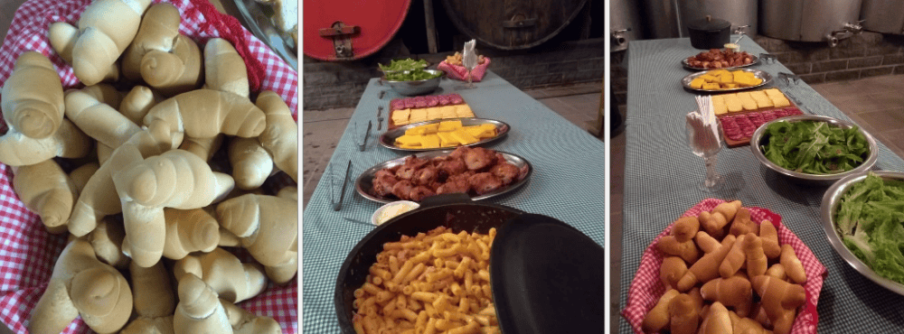 Macarrão caseiro com molho de frango, Polenta caseira na grelha, Galeto no espeto, Queijo tipo colonial, Salame tipo colonial, Pão tipo colonial, Saladas, Radicci com bacon, Alface, Tomate, Sobremesa, Cuca, Grostoli, Sagu e creme.