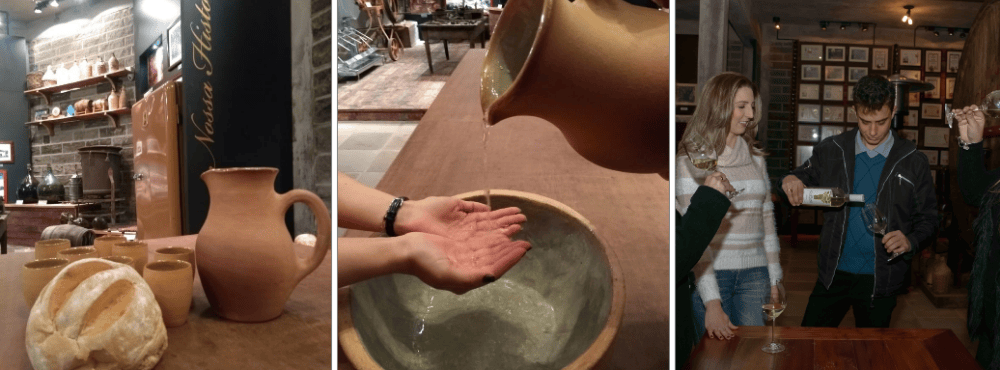 Momento de fé e reflexão, dentro da vinícola, com limpeza simbólica das mãos e partilha do pão e do vinho remetendo às primeiras comunidades cristãs.